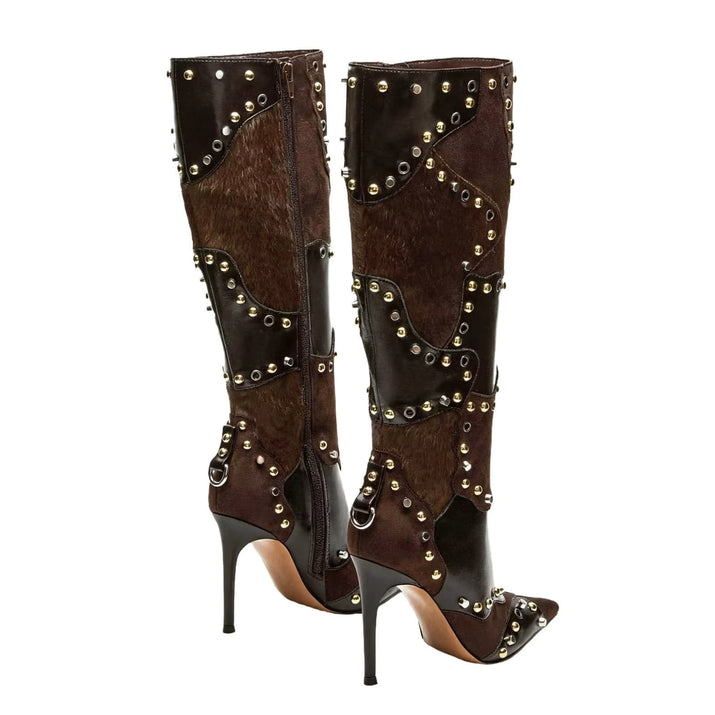 A limited Blâgé creation — sculpted knee-high masterpiece, crafted in bold patchwork metalwork and midnight shine. Designed to elongate your silhouette and command the room with every step.
